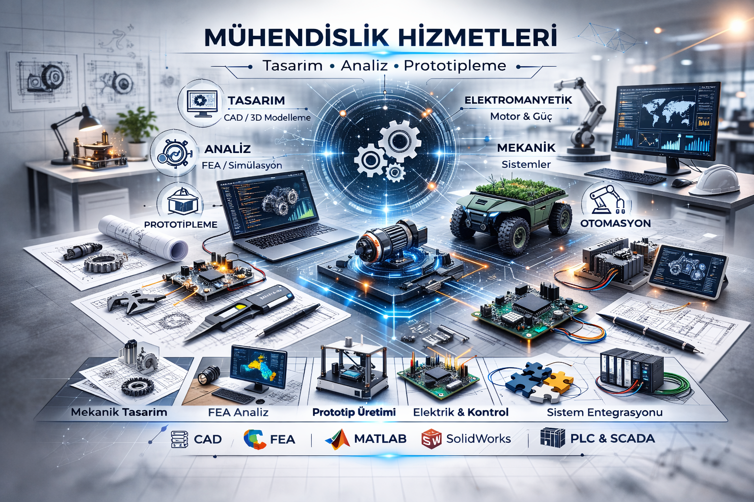 Makine, elektrik ve mekatronik sistemler için tasarım, optimizasyon ve performans analiz hizmetleri sunuyoruz. Sonlu elemanlar analizi (FEA), termal analiz, yapısal dayanım hesapları ve sistem entegrasyonu konularında teknik doğruluk esaslı çalışmalar yürütüyoruz.